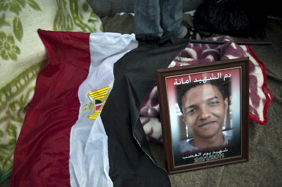 The portrait of 18-year-old Egyptian anti-government protester Maath Sayed Mohammed Kamel, killed on January 28, 2011, sits next to an Egyptian flag at the place where he died during clashes between demonstrators and security forces in central Cairo's Tahrir Square, as the 18th day of protests against President Hosni Mubarak's regime began in the landmark square on February 11, 2011. (Pedro Ugarte/AFP/Getty Images)